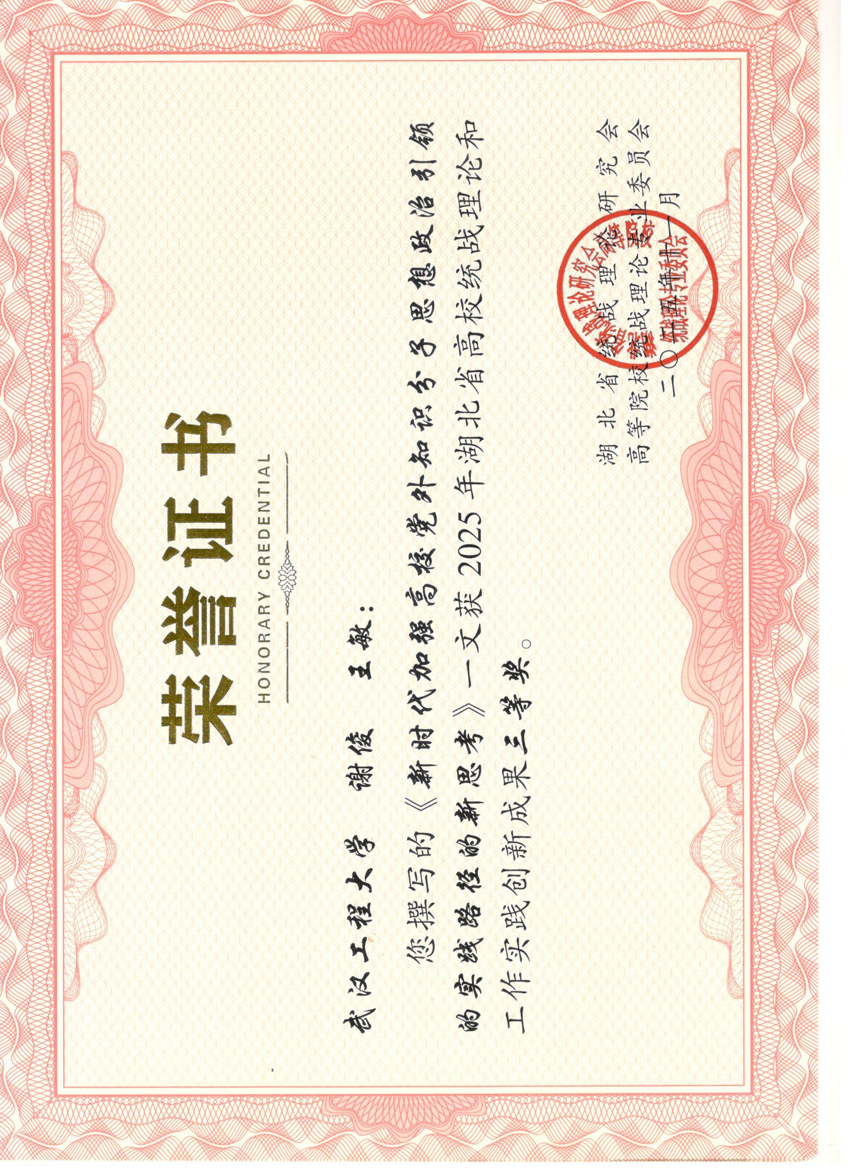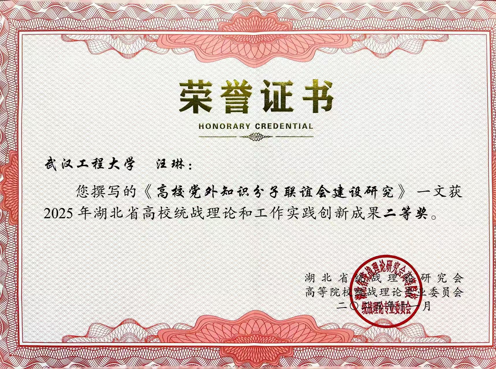 会议表彰了2025年湖北省高校统战理论研究论文获奖篇目和优秀组织奖单位,我校法商学院汪琳撰写的论文《高校党外知识分子联谊会建设研究》荣获二等奖,马克思主义学院谢俊和党委统战部王敏联合撰写的论文《新时代加强高校党外知识分子的思想政治引领的实践路径的新思考》荣获三等奖,计算机科学与工程学院(人工智能学院)辅导员昌檀撰写的《“两个结合”视域下高校铸牢中华民族共同体意识教育的实践创新》获优秀奖。